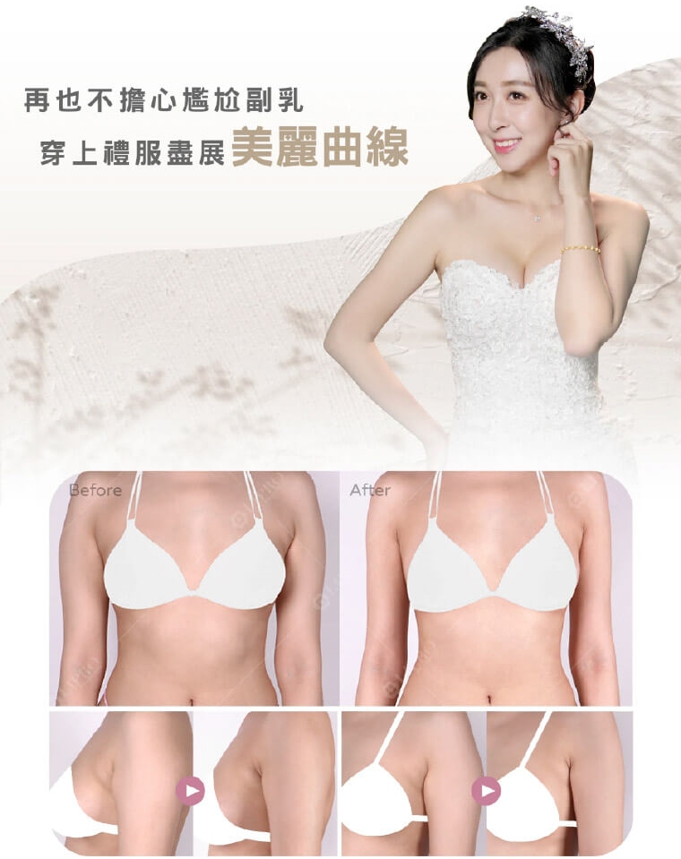 副乳是先天因素,無法靠運動或是按摩解決,穿內衣也無法解決問題。麗波團隊專注於細節,重視精緻美感,使用顯微套管抽脂的小管徑,均勻減少乳腺及脂肪,皮膚自然回彈,化簡為繁,輕鬆舒適,術後不用穿塑身衣,不用按摩,疼痛度極低,當天即可自行回家,隔天上班,旁人毫無察覺,是結合優雅與美感的手術。