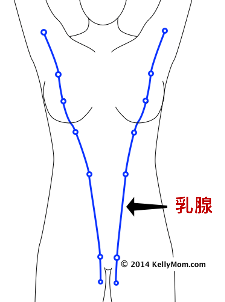 要理解副乳的位置,需先認識「乳線(milk line)」的概念。乳線是胚胎發育時期形成的一對對稱性乳腺紋,從腋下起始,延伸至腹股溝,呈現一條對角延伸的假想線。這條線都可能出現副乳,最常見的部位是腋下副乳。研究指出,約 60%~70%的副乳位於腋下,其餘出現在乳房下緣、胸骨旁、腹部、鼠蹊部、外陰或大腿處。副乳可能單側或雙側出現,雙側以右側比例略高。