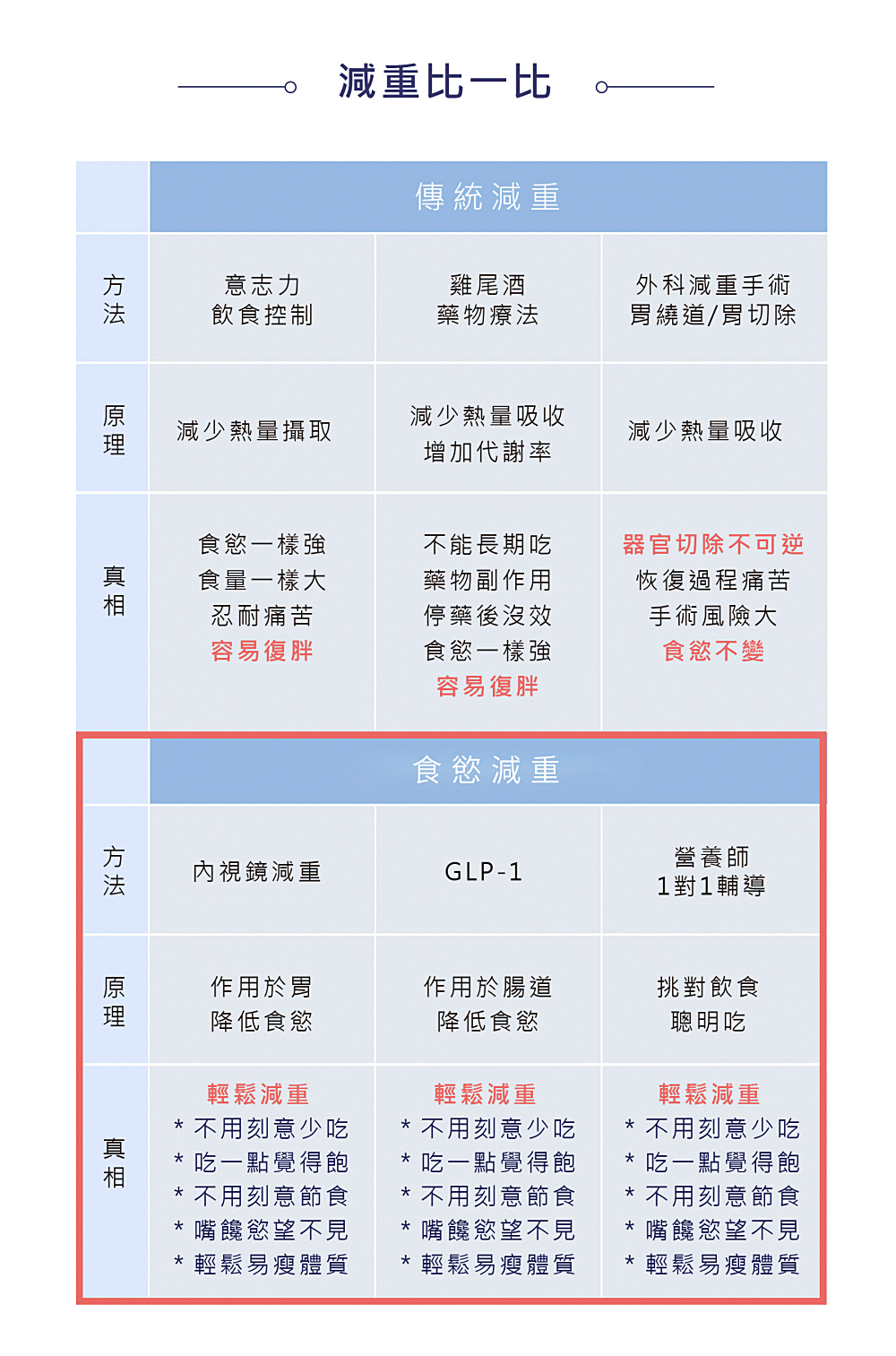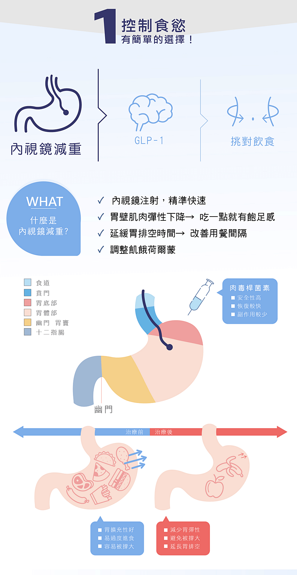 不健康的節食減重往往都以復胖收場,如果沒有控制住食慾就會一直想要吃。藉由內視鏡無痛注射在正確位置上,可以達到製造飽足感、降低胃排空、改變飢餓荷爾蒙,擺脫想吃的慾望,號稱是一種不挨餓且幸福的無痛減肥法。