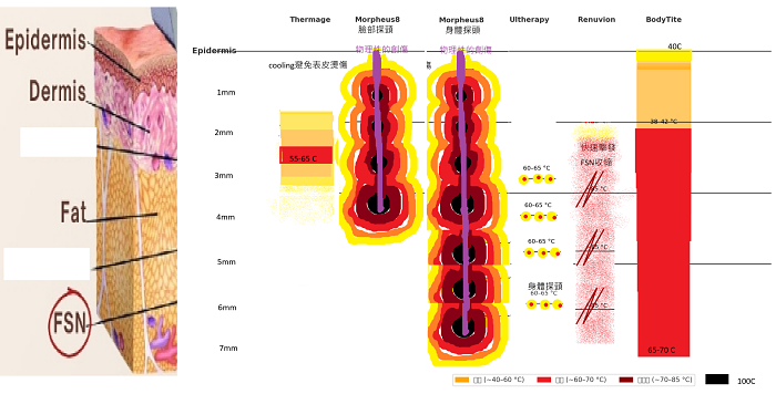 Thermage、Morpheus8、Ulthera、Renuvion 與 BodyTite 在皮膚不同深度的加熱效果比較。圖中顏色代表溫度層次:黃色約 40–60 °C(輕度加熱)、紅色約 60–70 °C(膠原收縮與新生)、深紅約 70–85 °C(更強收縮)、黑色 >100 °C(微小消融)。可見各儀器在表皮、真皮、脂肪與 FSN 層的差異性。圖片展示五種醫美能量設備的加熱分布: