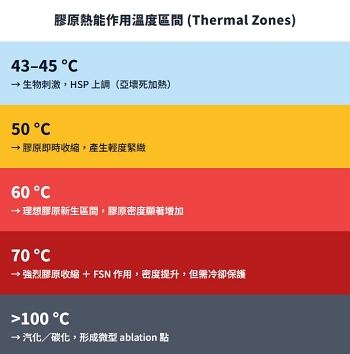 在 60–70 °C(秒級作用) 的瞬間加熱,還會形成「凝固帶(coagulation zone)」。這個區間被視為能量治療的黃金關鍵,因為它結合了即刻收縮與長期重塑的雙重效果。