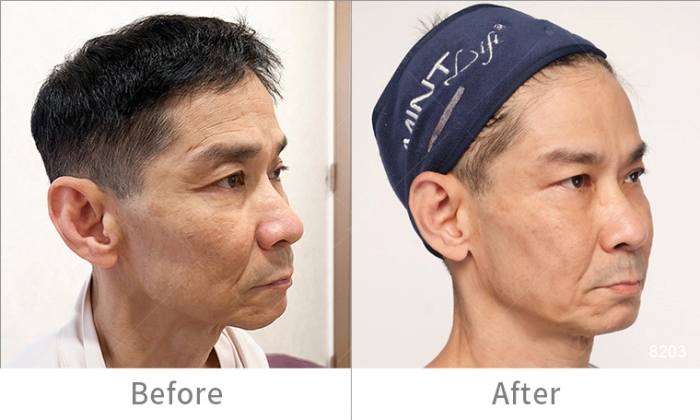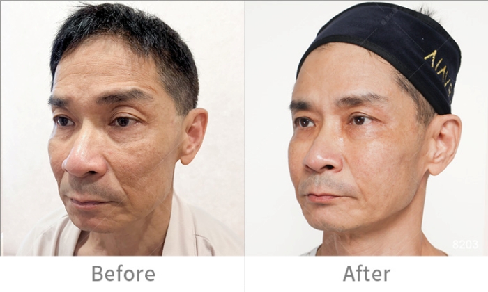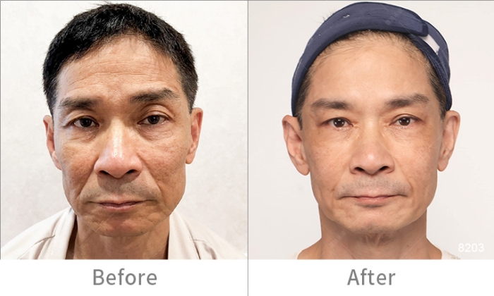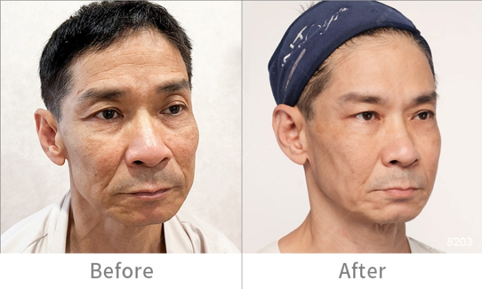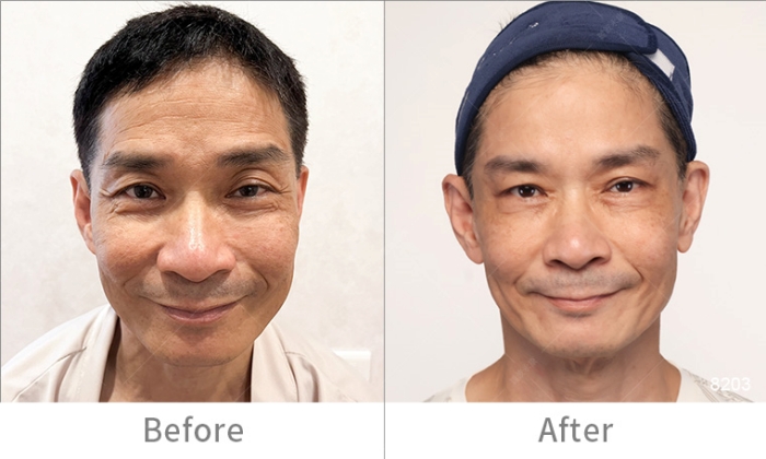 案例為50+歲男性接受全臉深中淺三層次治療,重點加強法令紋與雙頰鬆弛區域。治療前左側臉頰略顯凹陷、嘴邊肉下垂,術後第8週,整體輪廓回升、法令紋變淺、下顎線俐落有型。這是因為,墨菲斯電波對皮下脂肪層與FSN結構的同步作用,促進均質化膠原生成,達到提升與支撐。