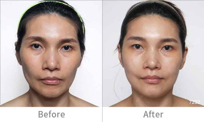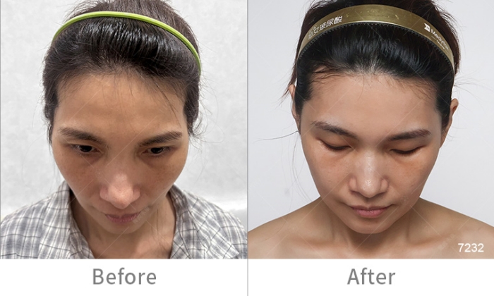 眼下泡泡眼與細紋是視覺年齡感上升的主因。本案例為女性眼周老化治療,原先眼尾及下眼皮有明顯皺摺與凹陷,在術後第4週明顯改善,眼袋比較緊實、淚溝變淺、整體精神感。