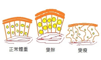 圖中能明顯看出,體重增加時,FSN結構被撐開、纖維間距拉大;而在減重或抽脂之後,原本被拉長的FSN纖維隔膜失去張力,無法有效支撐皮膚,因而出現減肥後皮膚鬆弛與塌垂的狀況。