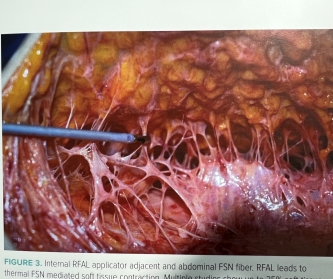 FSN是連接真皮層與皮下脂肪的緻密立體支架,一旦其結構弱化或斷裂,便會導致整片皮膚失去張力與支撐,就會像帳篷失去骨架,皮膚都會鬆弛。因此,若只著重於脂肪移除的抽脂術式,未處理FSN結構的完整性,經常會出現「瘦了卻鬆」的反效果。即便後續輔以能量療程(如電波、音波),熱能無法精準作用在 FSN所在的深層筋膜組織,緊緻效果也會大打折扣。