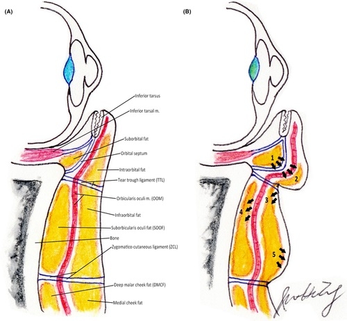 問題在於淚溝這個區域本身結構就很複雜。眼下有tear trough ligament(淚溝韌帶),像一條繫帶固定在骨頭上,周邊又有深淺不同的脂肪隔間、眼輪匝肌等層次交疊,任何一個隔間的材料過多,材質會被韌帶擋住或被牽扯,就容易有饅化現象。