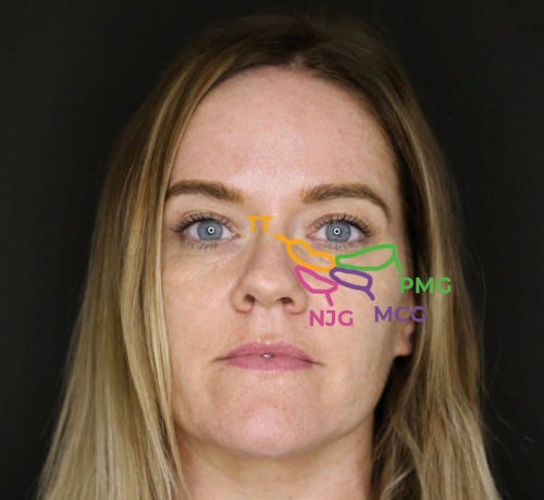 治療時若一味把淺層打滿,容易饅化,變成「奪魂鋸面具人」。正確觀念是,中臉各層次厚度太厚,治療也要朝著這個方向著手。