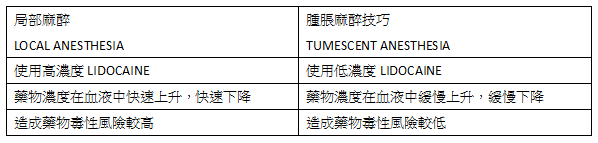 同樣是使用「利度卡因Lidocaine」麻醉,究竟一般局部麻醉和腫脹麻醉技巧tumescent technique差異為何?即使給予了一定藥物量,重點在於如何減緩血液中藥物濃度上升的速度,讓藥物不良反應的機率降到最低。