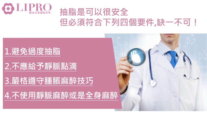 抽脂是可以很安全的進行的,但必須符合下列四個要件,缺一不可
