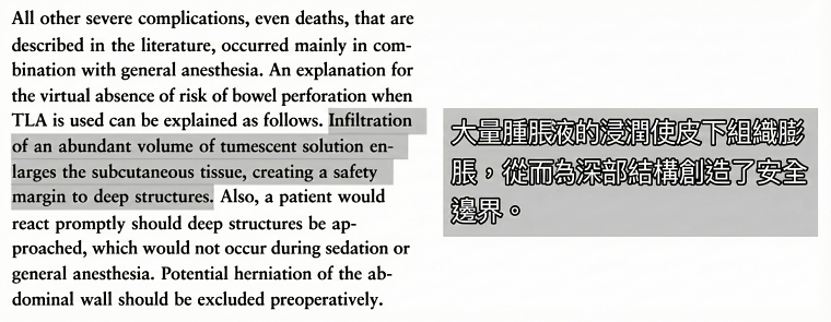 | 四代:腫脹麻醉 | 2 - 3 : 1 | < 1% (微乎其微) | 完全清醒 (局部麻醉) | 黃金標準 零死亡率紀錄 | 國際專家首選 |