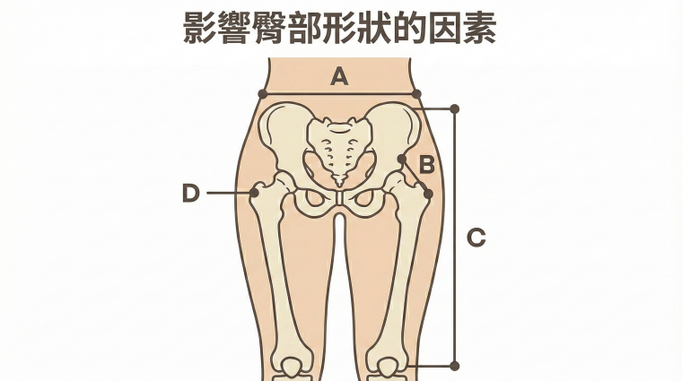 臀凹陷的深淺也會受到皮下脂肪厚度與筋膜牽拉影響。同樣體脂下,有的屁股兩側凹陷很深,有的只是淡淡一點陰影,原因除了骨盆與股骨的大框架,還有脂肪厚薄、筋膜黏著及肌腱走向。