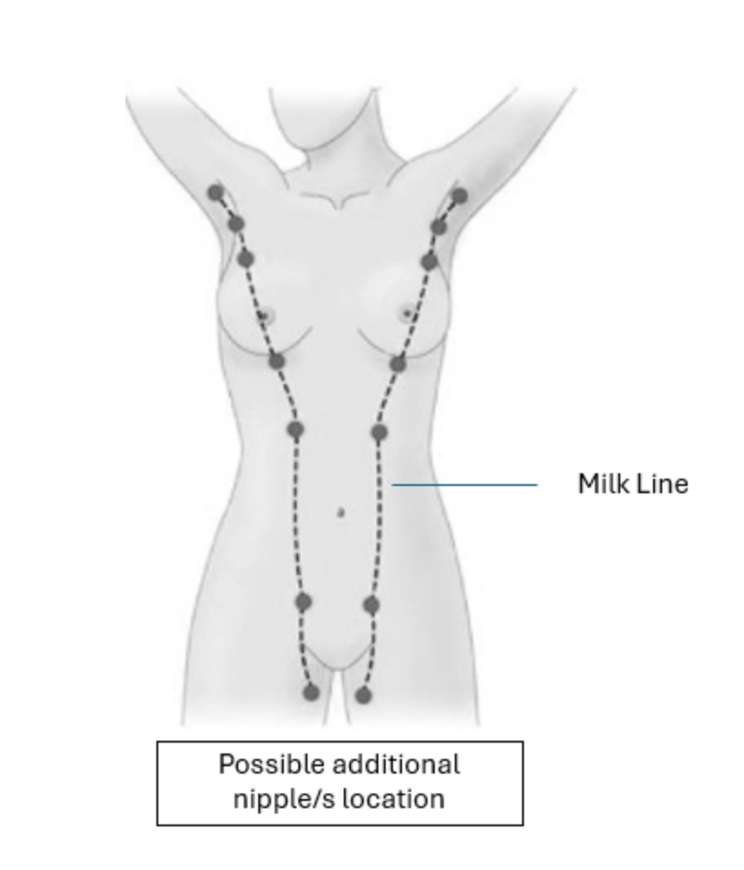 在胚胎發育過程中,乳房是沿著一條稱為「乳線(milk line)」的結構形成的。大部分人出生後的乳線會自然退化,若未完全退化會在腋下或其他部位留下乳腺組織,形成「副乳」。