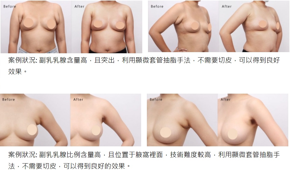 | 淺層(皮下脂肪層) | 副乳腺體、表層脂肪、淺層淋巴管 | 副乳切除、腋下抽脂 |