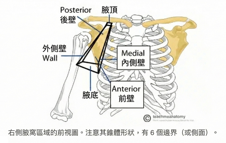 腋下空間(圖片的錐狀區域)是所有腋下淋巴結的主要分布區,其中最深層、靠近腋頂處與內側壁交界的深層脂肪,是前哨淋巴結常見的位置。
