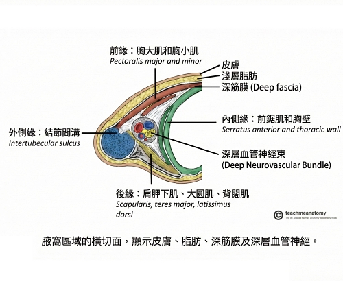 | 深層(腋窩脂肪墊) | 前哨淋巴結、腋動靜脈、臂神經叢 | 乳癌手術、腫瘤外科損傷 |