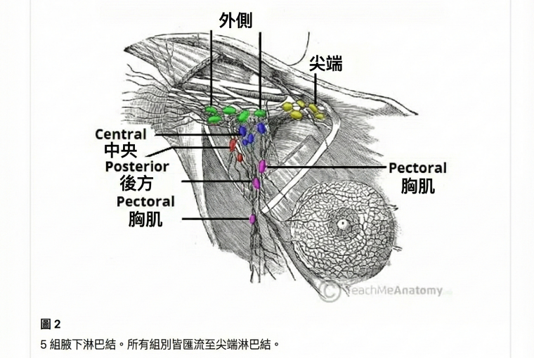 ✔腋下淋巴結:是廣義的區域性免疫系統,負責收集並處理來自上肢、胸部以及背部上方的淋巴液,在解剖學上又分為五組(胸肌組/位於胸大肌下緣、後組/沿肩胛下分布、外側組/位於腋靜脈遠端、中央組/位於腋窩脂肪墊中央,以及所有淋巴引流最終匯聚的尖端組)共同組成的防禦結構網。