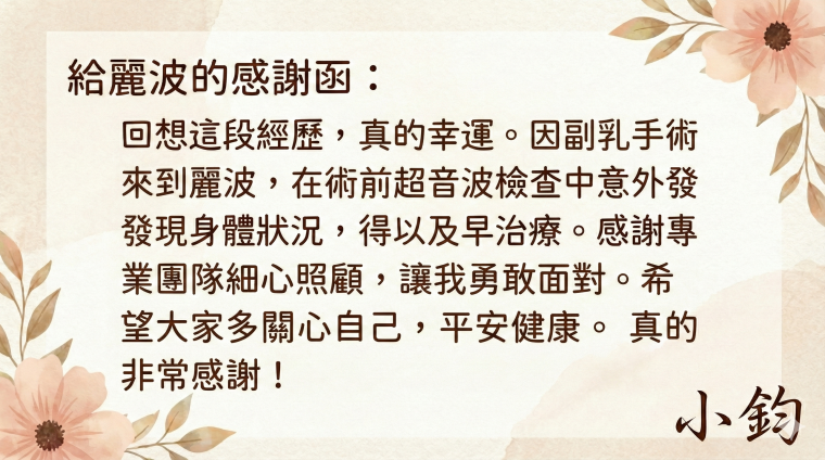 經過治療後一切都穩定,她又回來找我們,完成當年那個被暫停的小心願。她還特別說,希望把她的故事分享出來,提醒大家要重視檢查,也告訴那些正在害怕的人,就算真的遇到了也要勇敢面對,也因為這個故事,我更確認並堅持:所有副乳手術前,一定要先做乳房超音波檢查。
