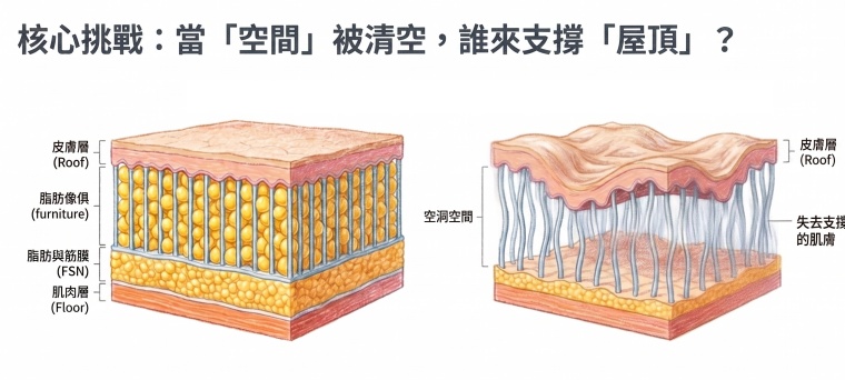 | 問題層次 | 真皮層+FSN鋼骨鬆脫 | 脂肪層+FSN負擔過重 |