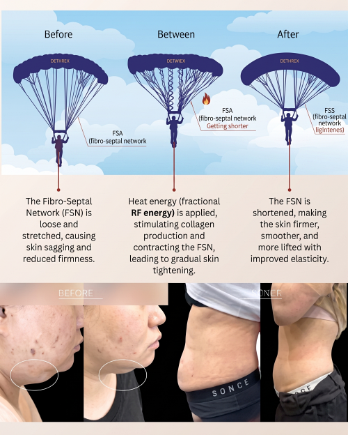 我們可以把皮膚想像成一件緊身衣,而FSN(Fibroseptal Network,纖維隔膜網路)是無數條、連接衣服與身體的『立體鬆緊帶』。