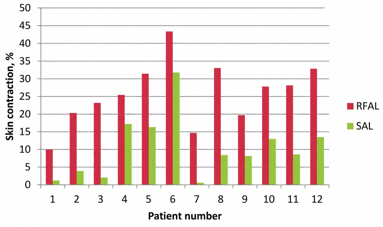 ⮕治療6週後的皮膚收縮比例發現,大多數受試者在加入RF熱能後,皮膚收縮比例均明顯高於單純抽脂組。