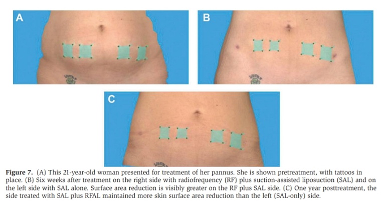 國際權威期刊《Aesthetic Surgery Journal》研究顯示,12位進行腹部抽脂的受試者,採取左右對照的嚴謹實驗,腹部的一側單純抽脂SAL,另一側則在抽脂時同步合併鈦特離子夾BodyTite。