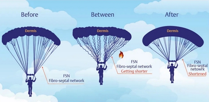 FSN不只是垂直的拉繩,更是一個橫向與縱向交織的立體膠原纖維網,負責固定脂肪軟組織,並將皮膚牢牢地錨定住,撐起皮膚的建築支架。