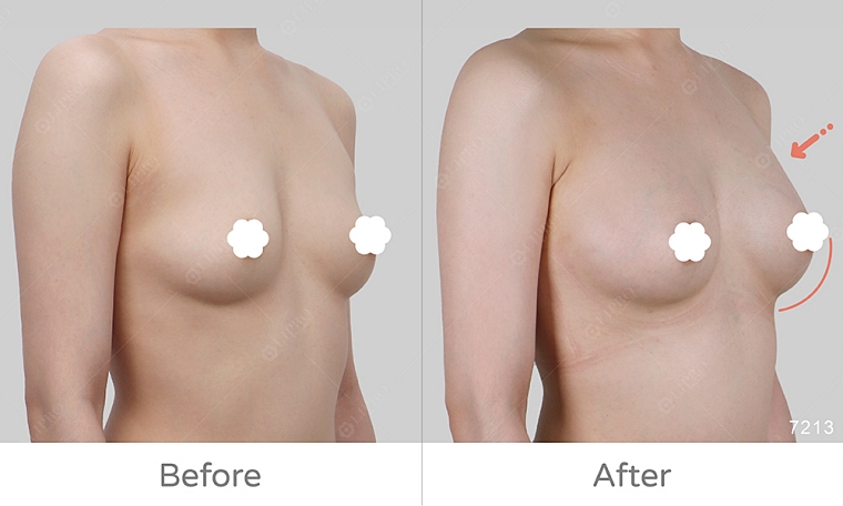 (右圖)豐胸後的胸型飽滿自然,副乳改善。