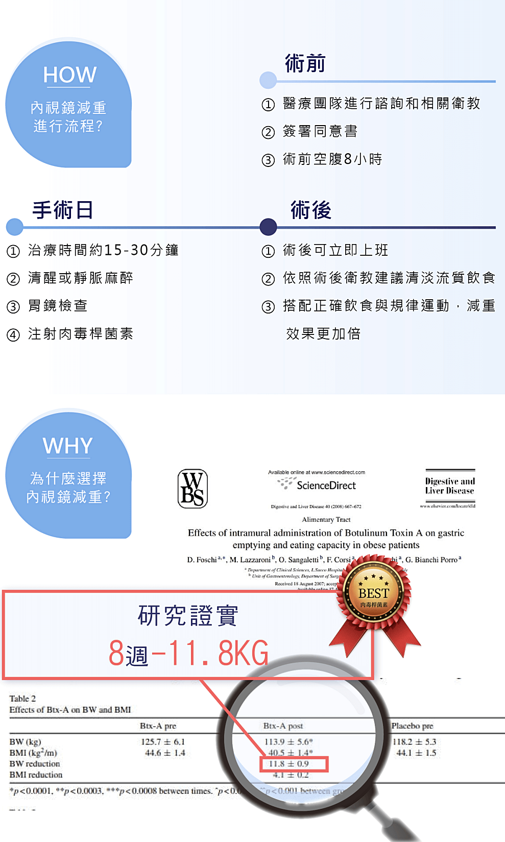 不健康的節食減重往往都以復胖收場,如果沒有控制住食慾就會一直想要吃。藉由內視鏡無痛注射在正確位置上,可以達到製造飽足感、降低胃排空、改變飢餓荷爾蒙,擺脫想吃的慾望,號稱是一種不挨餓且幸福的無痛減肥法。